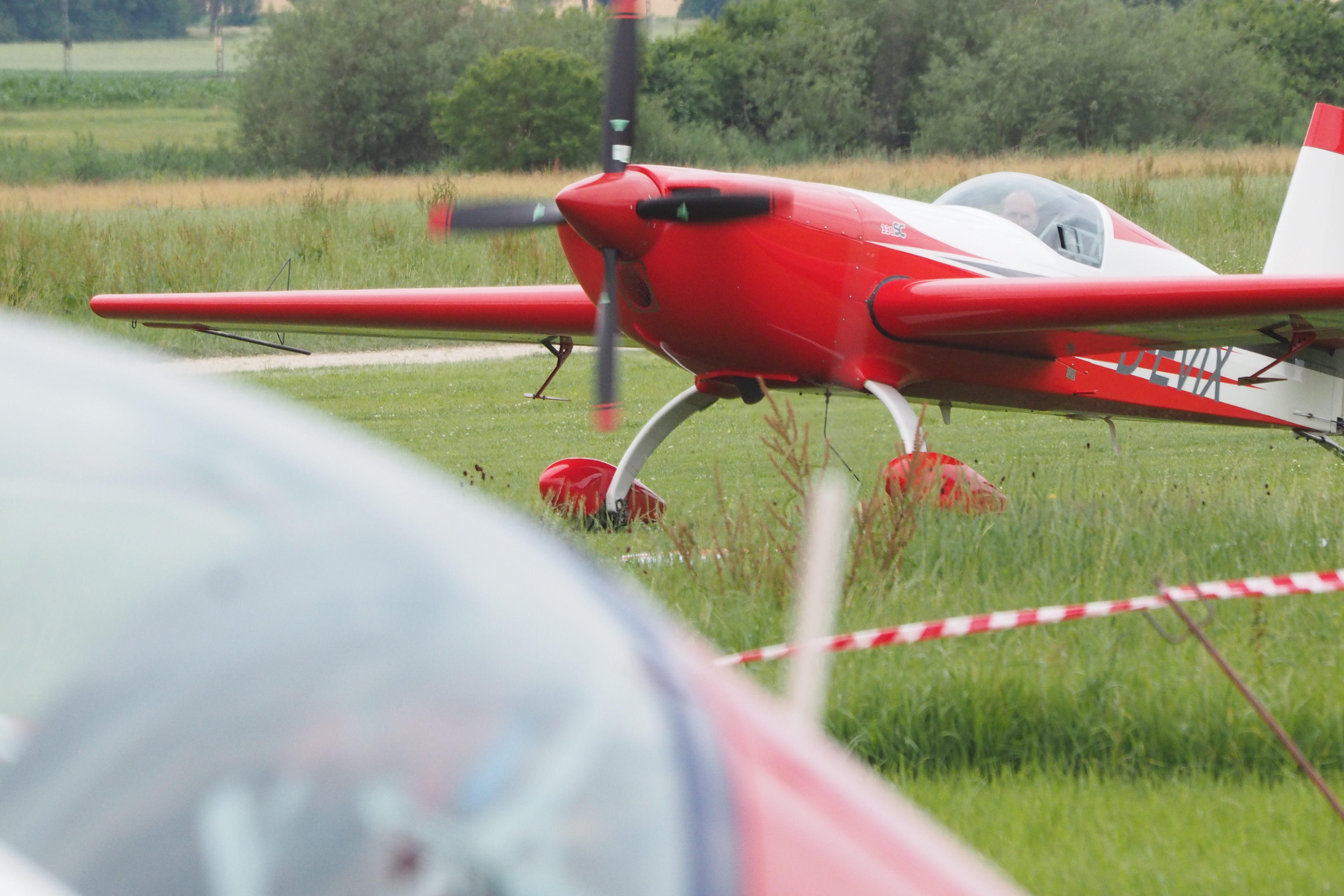 Gegen 18 Uhr näherte sich aber aus Richtung Markt Berolzheim ein besonders kräftiger und lang anhaltender Schauer. Gerade noch rechtzeitig bevor die ersten Tropfen vom Himmel klatschten, haben wir unsere Flguzeuge in die Halle bekommen. Gott sei Dank war – wie andernorts – kein Hagel dabei. Das für den Abend geplante gemeinsame Grillen fiel aber buchstäblich ins Wasser. Und heute folgt ein Schauer dem anderen.